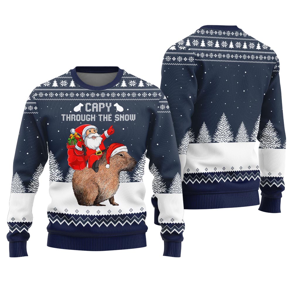 Explore the Quirky Style in Capybara Santa Through The Snow Ugly Christmas Sweater Navy