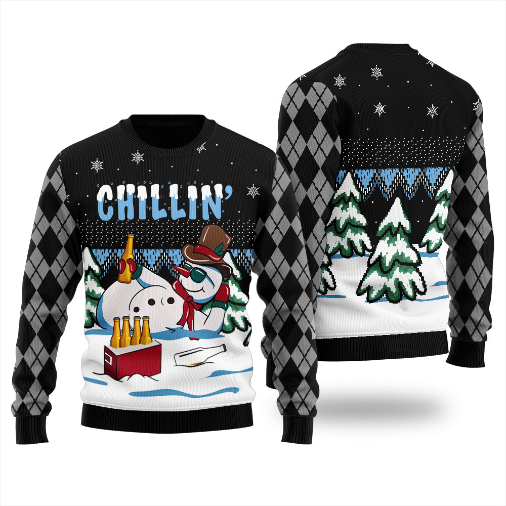 Chillin Snowman Funny Ugly Christmas Sweater Black