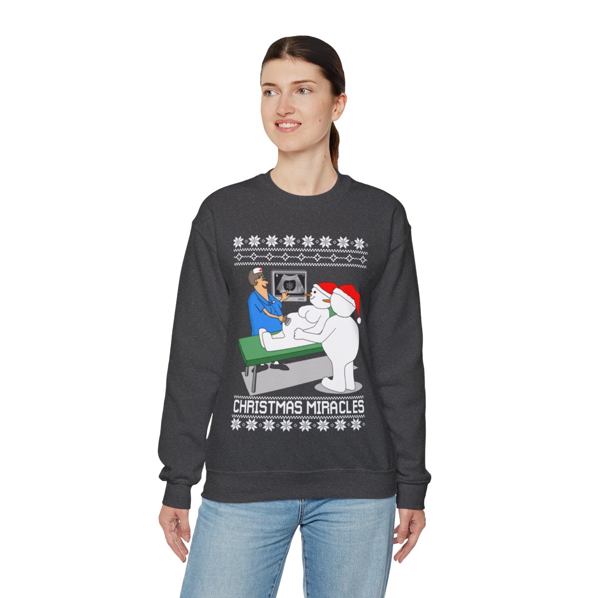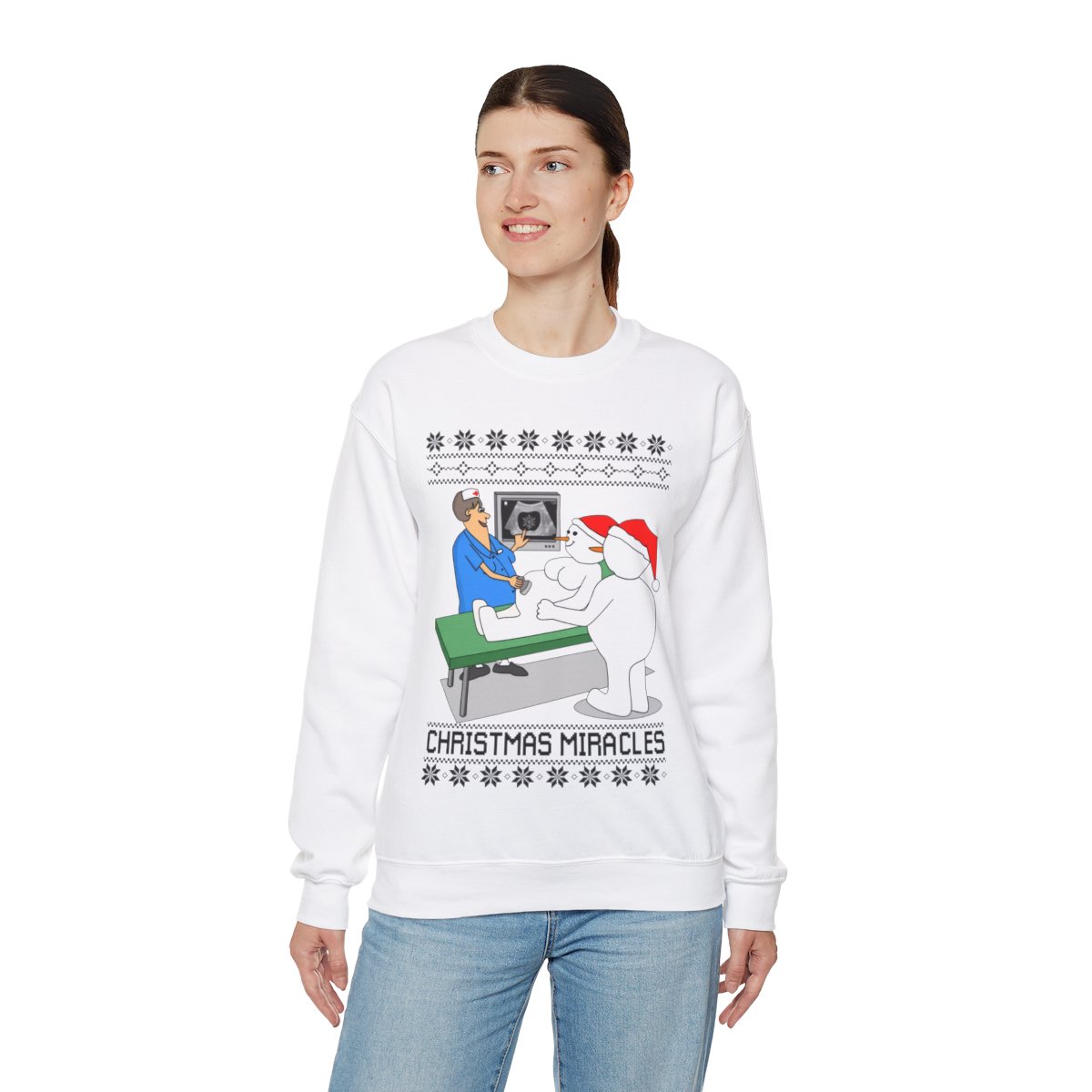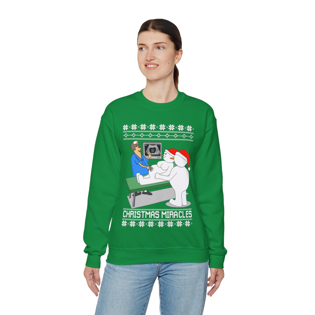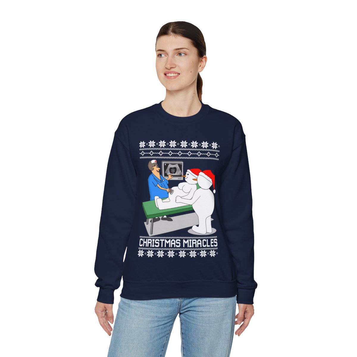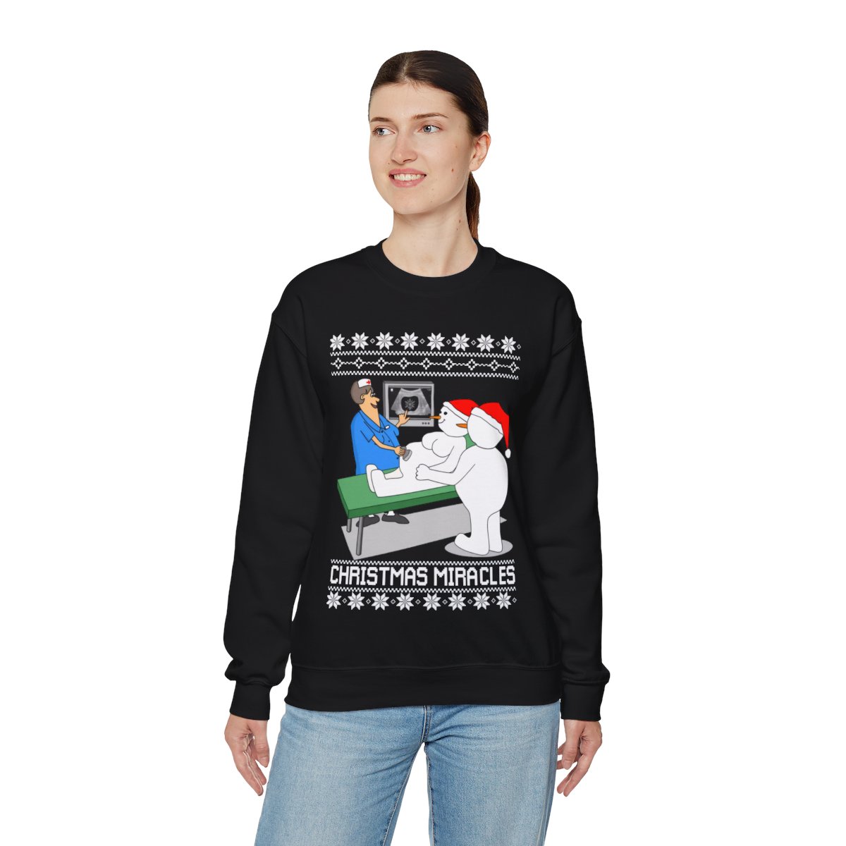 Put on Christmas Miracles Snowman Ugly Christmas Sweatshirt Womens to get in the spirit of the holidays