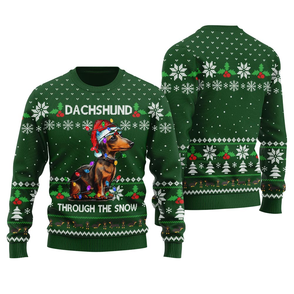 Dachshund Through The Snow Ugly Christmas Sweater Forest Green