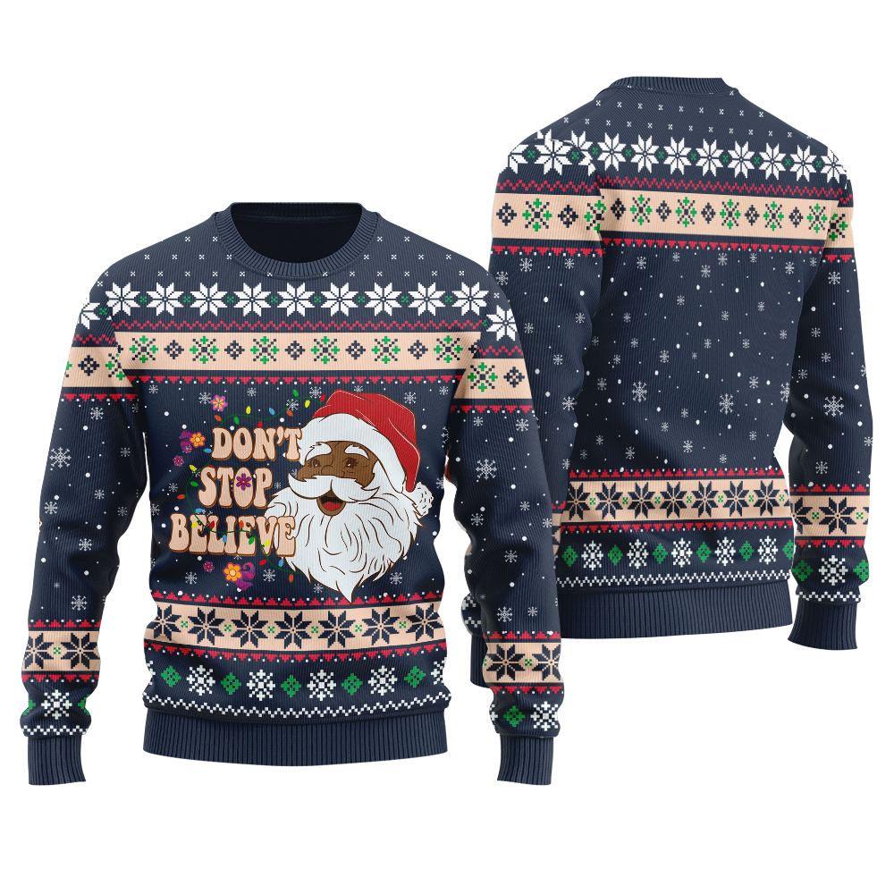 Dont Stop Believin African American Santa Claus Christmas Sweater Navy
