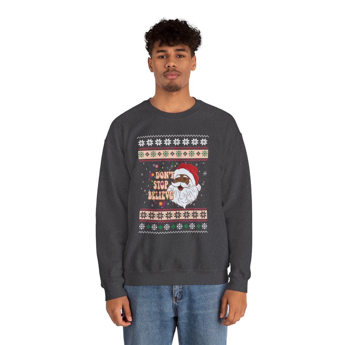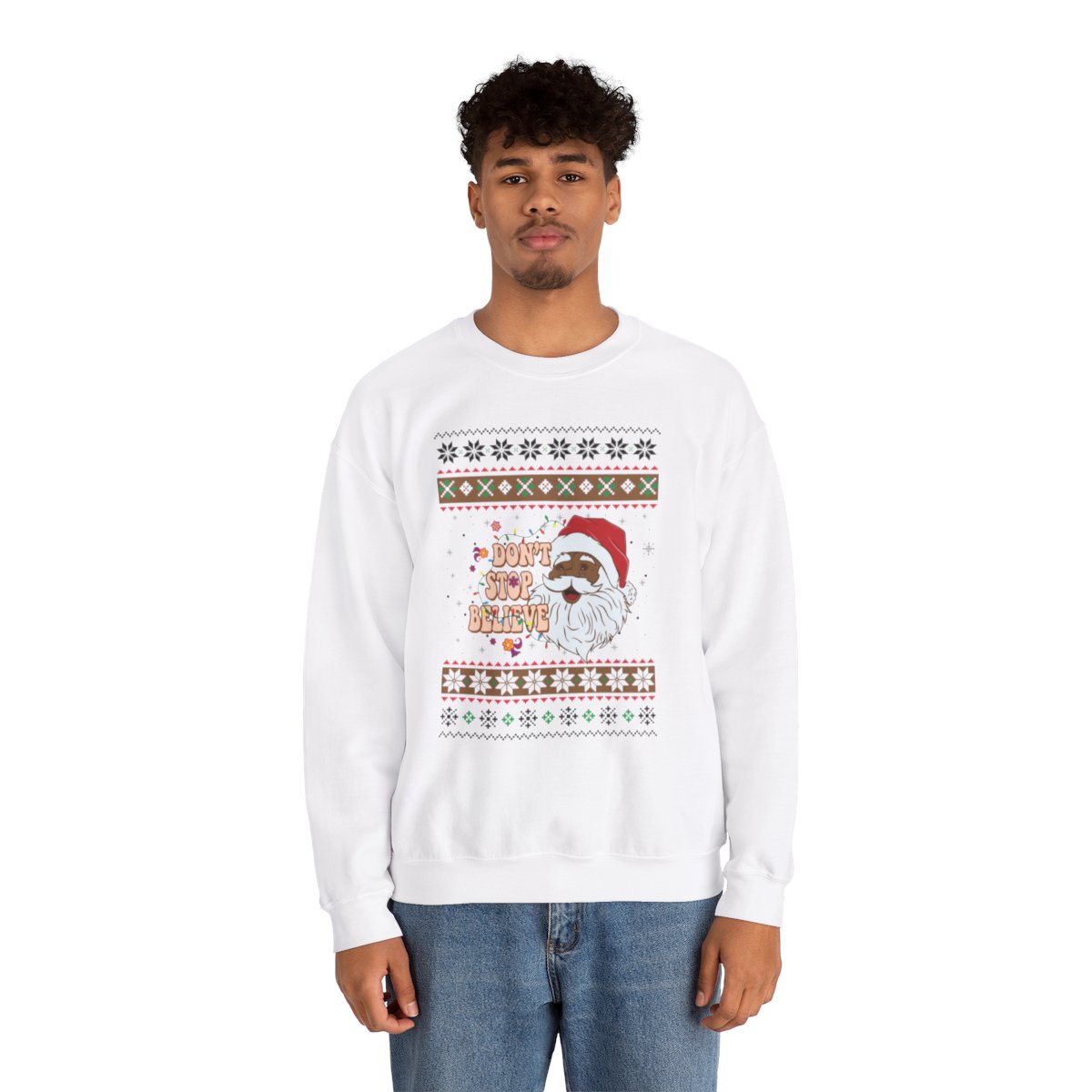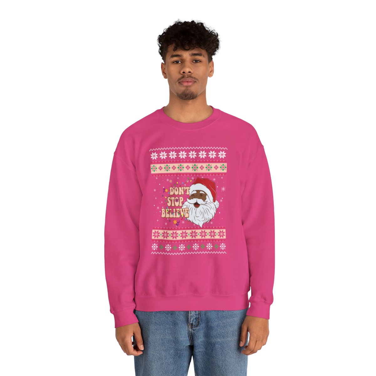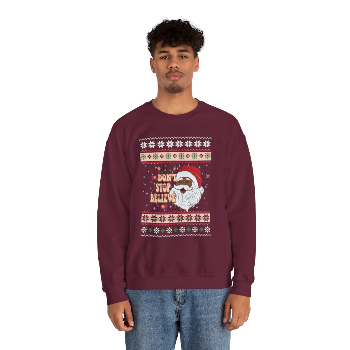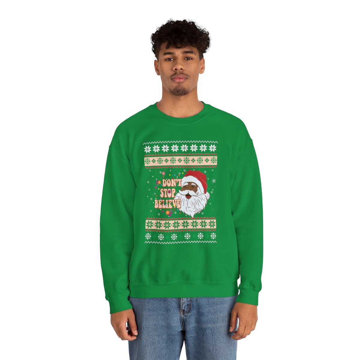 This Dont Stop Believin African American Santa Claus Ugly Xmas Sweatshirt has the power to unite souls and weave memories that shall be cherished for a lifetime. Why settle for a dull and drab sweater when you can don one that ignites conversations and brings a sparkle to the eye? Our Dont Stop Believin African American Santa Claus Ugly Xmas Sweatshirt has been meticulously crafted with utmost care to offer not only comfort but also a generous dose of panache. The distinctive and humorous designs adorning these sweaters are guaranteed to capture the attention of all who lay eyes on them!