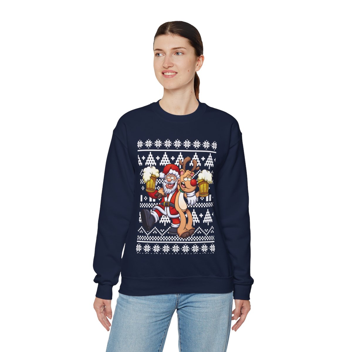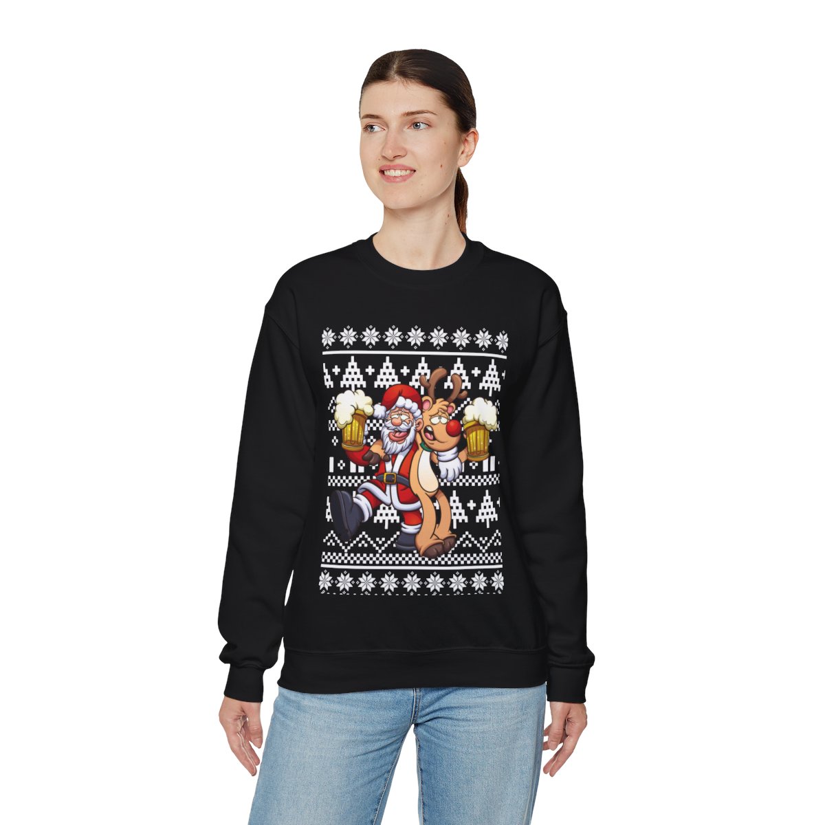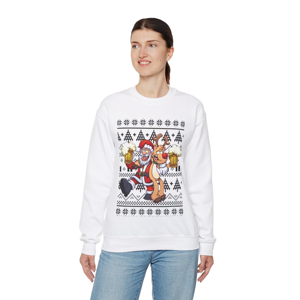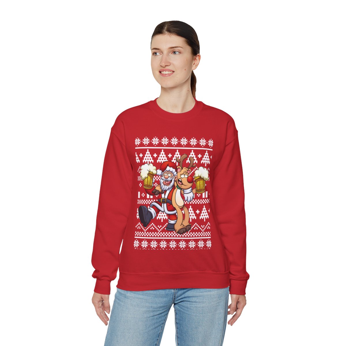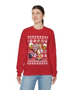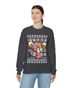 These sweaters may spark fascinating conversations and are a great way to flaunt your sense of humor. Imagine the grins and chuckles filling the room when you wear one of our eye-catching Elk and Santa Claus Ugly Christmas Sweatshirt Womens. You’ll instantly become the life of the party, making everyone happy and leaving enduring memories in your wake.
