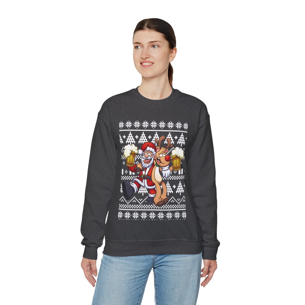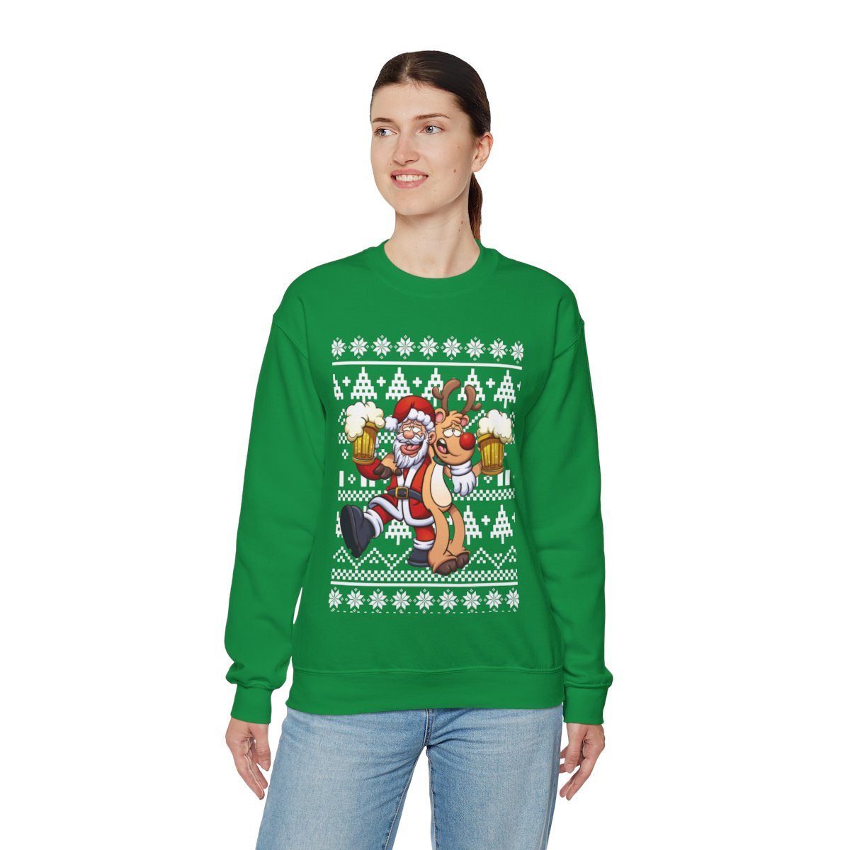 Put on Elk and Santa Claus Ugly Christmas Sweatshirt Womens to get in the spirit of the holidays