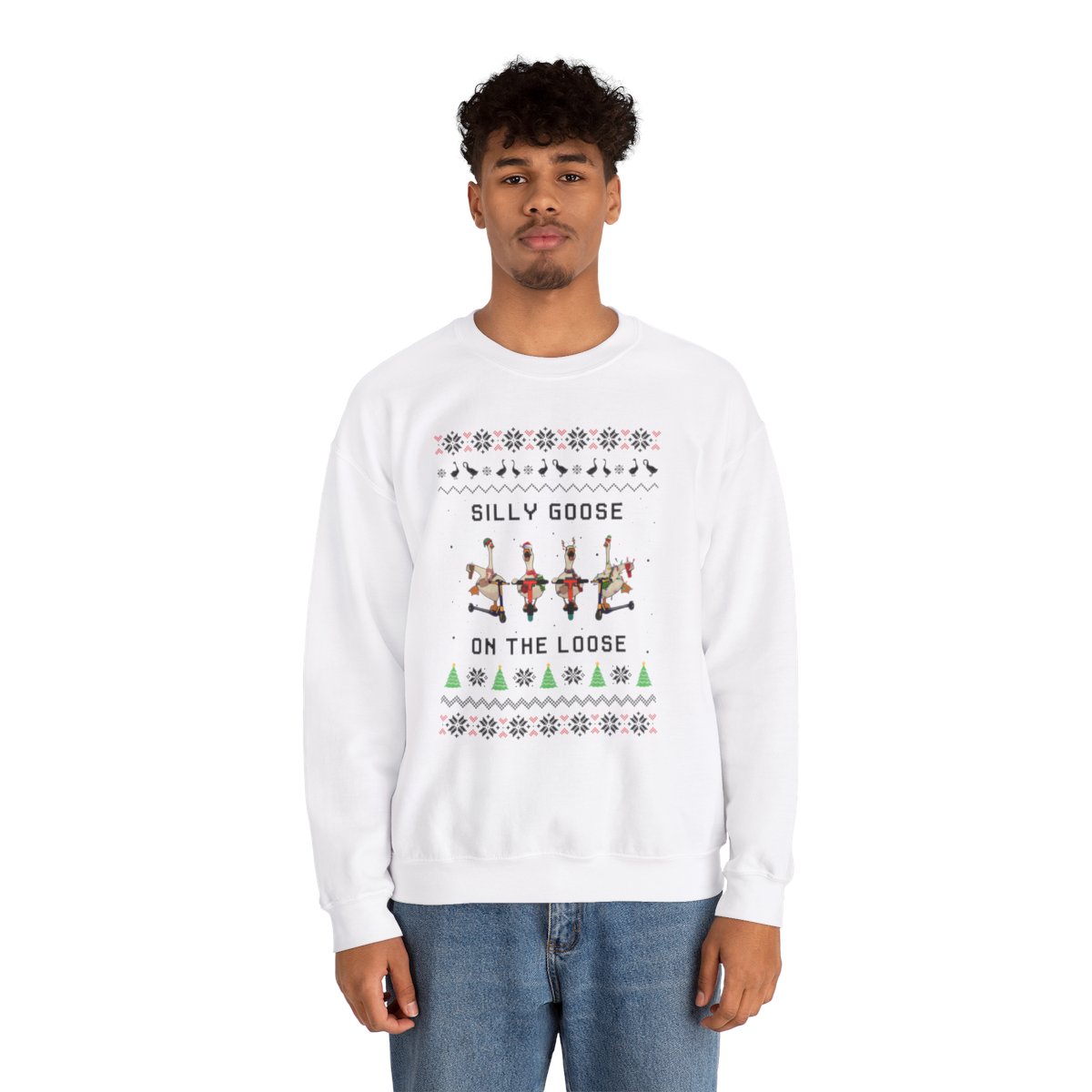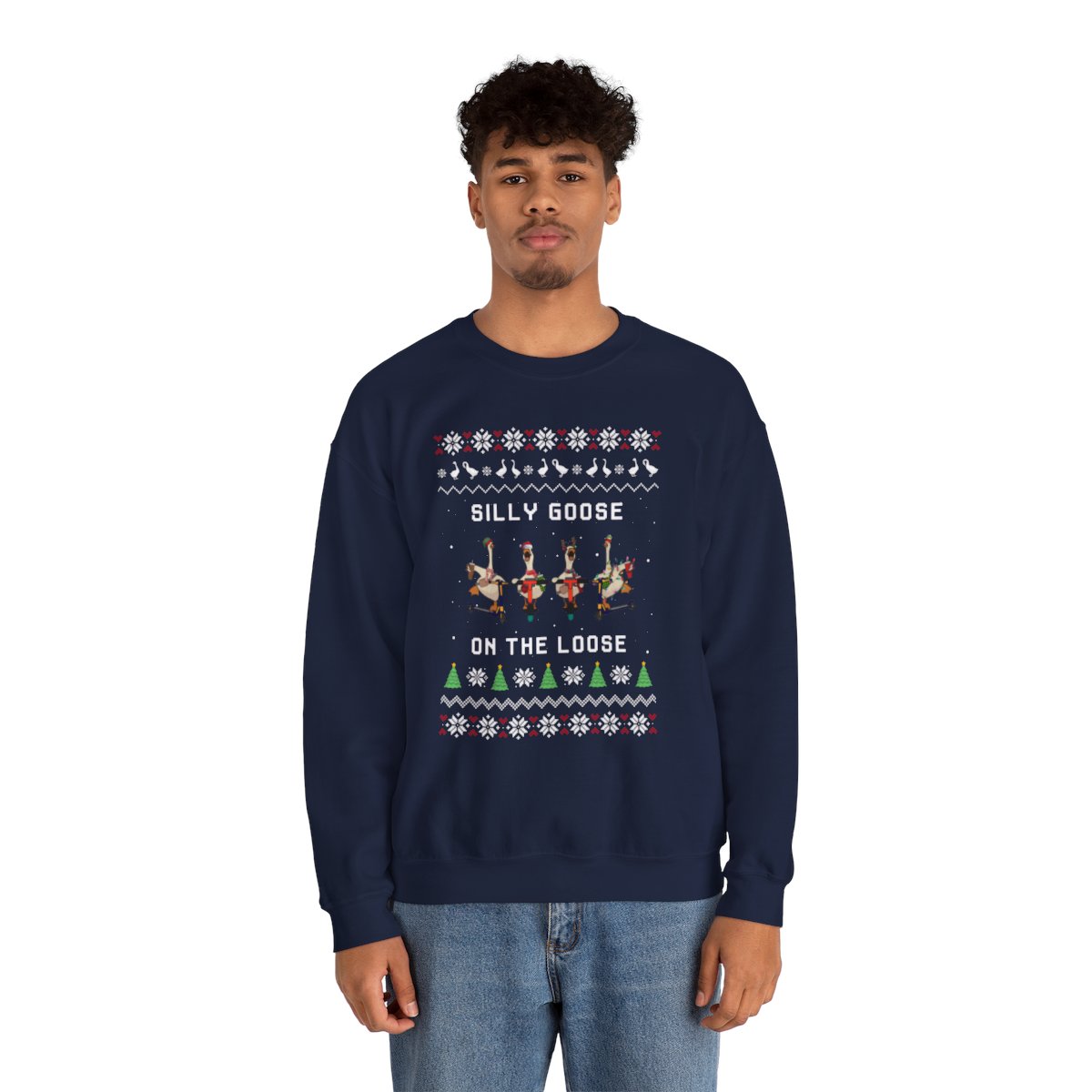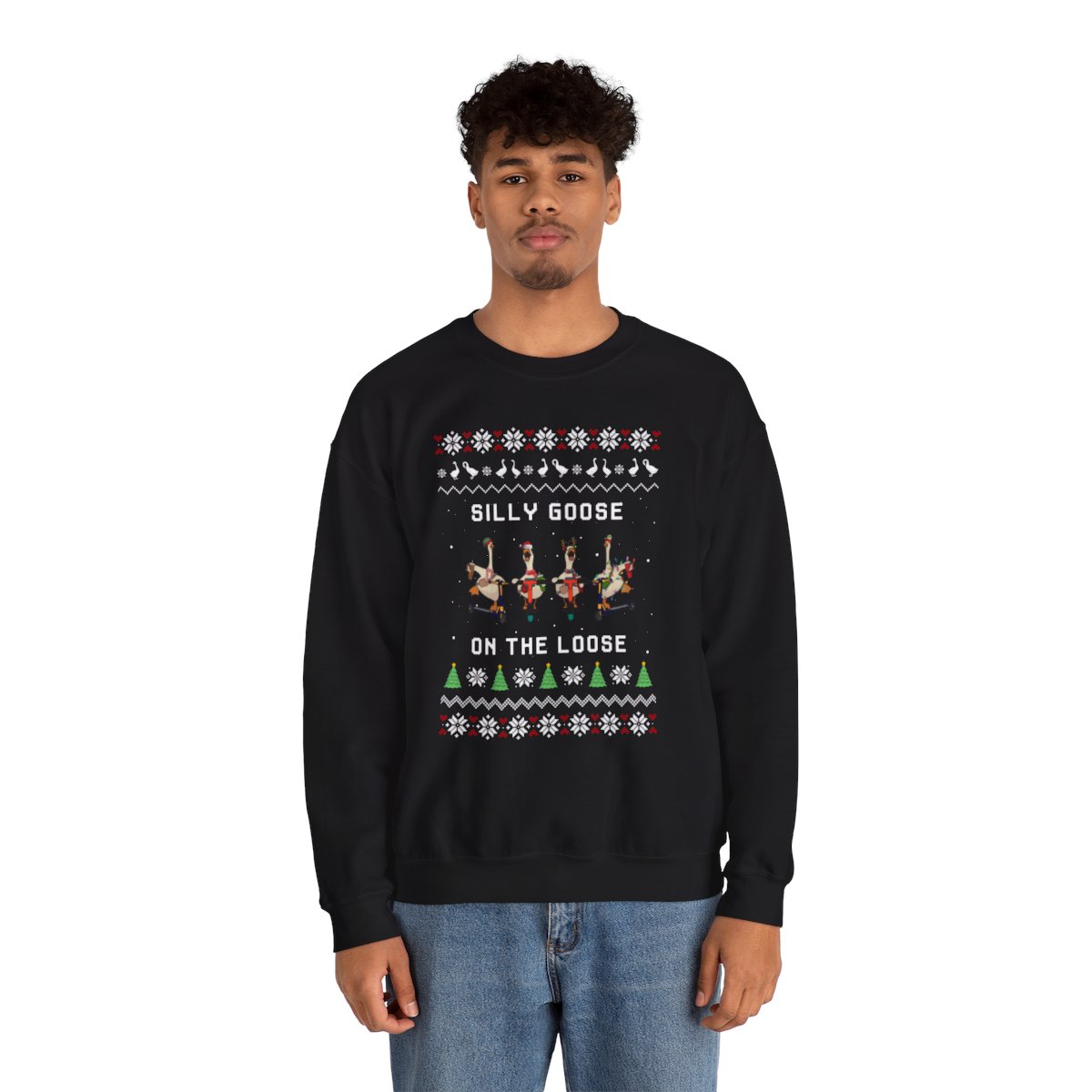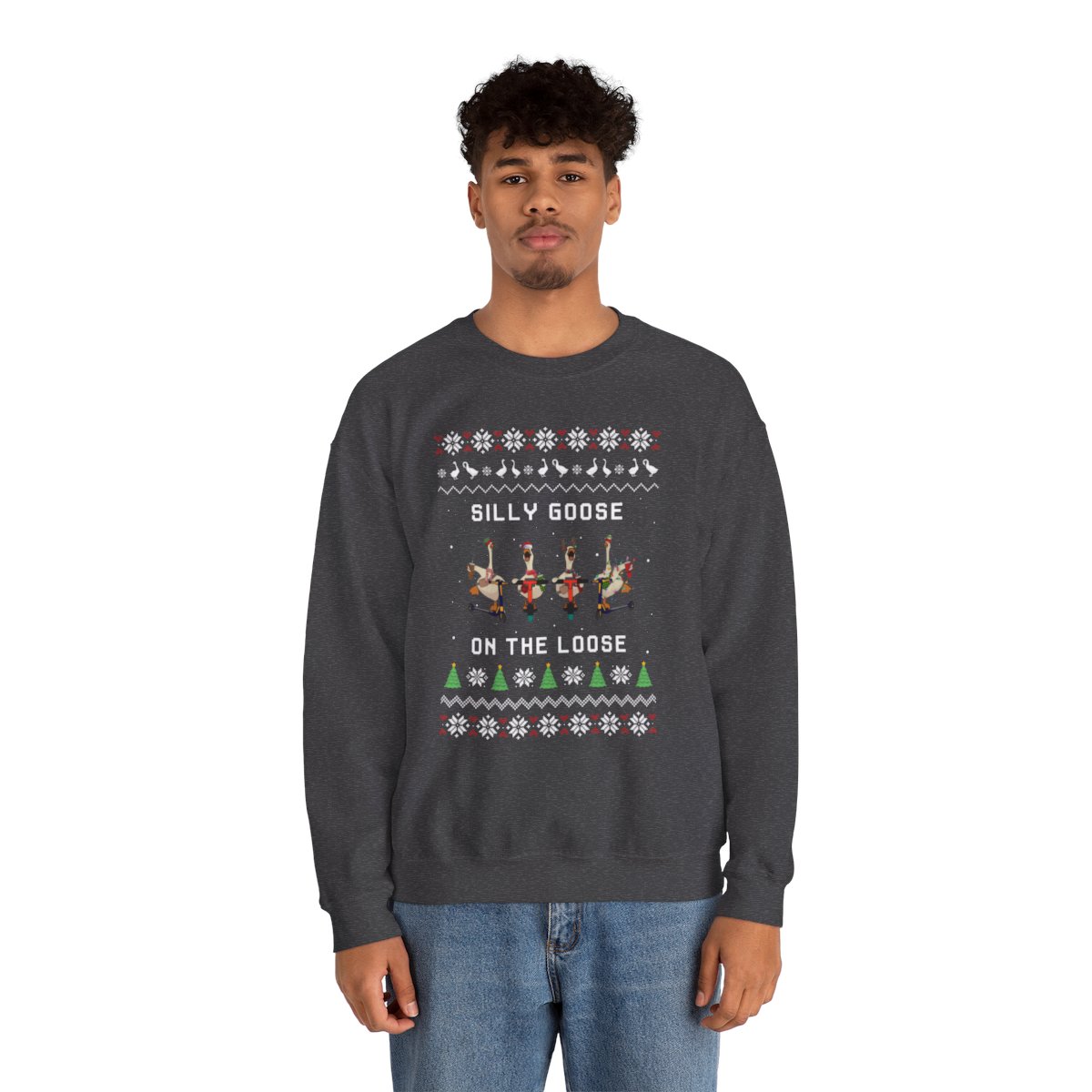 Put on Funny Goose Ugly Xmas Sweatshirt to get in the spirit of the holidays