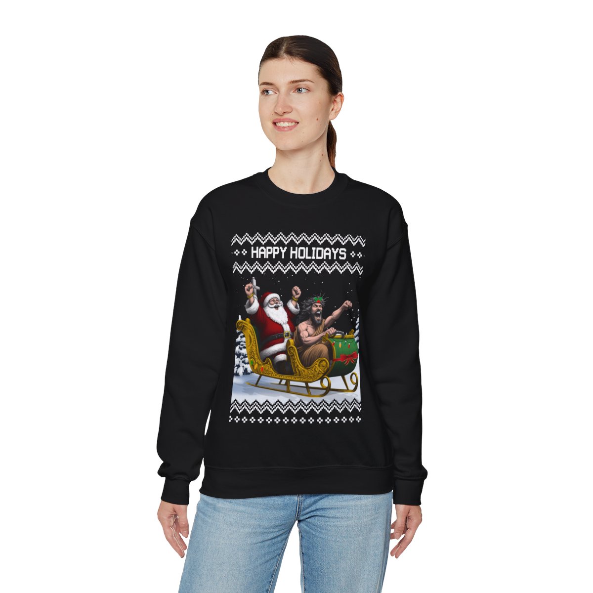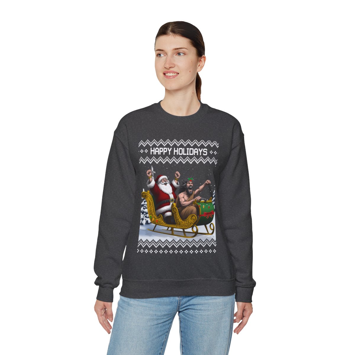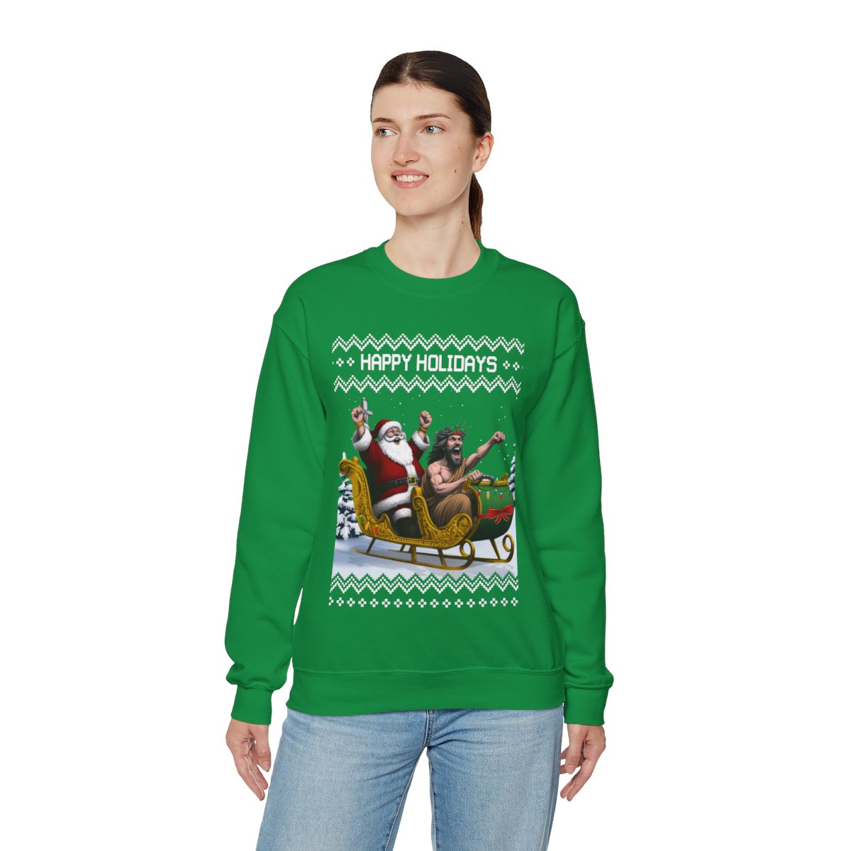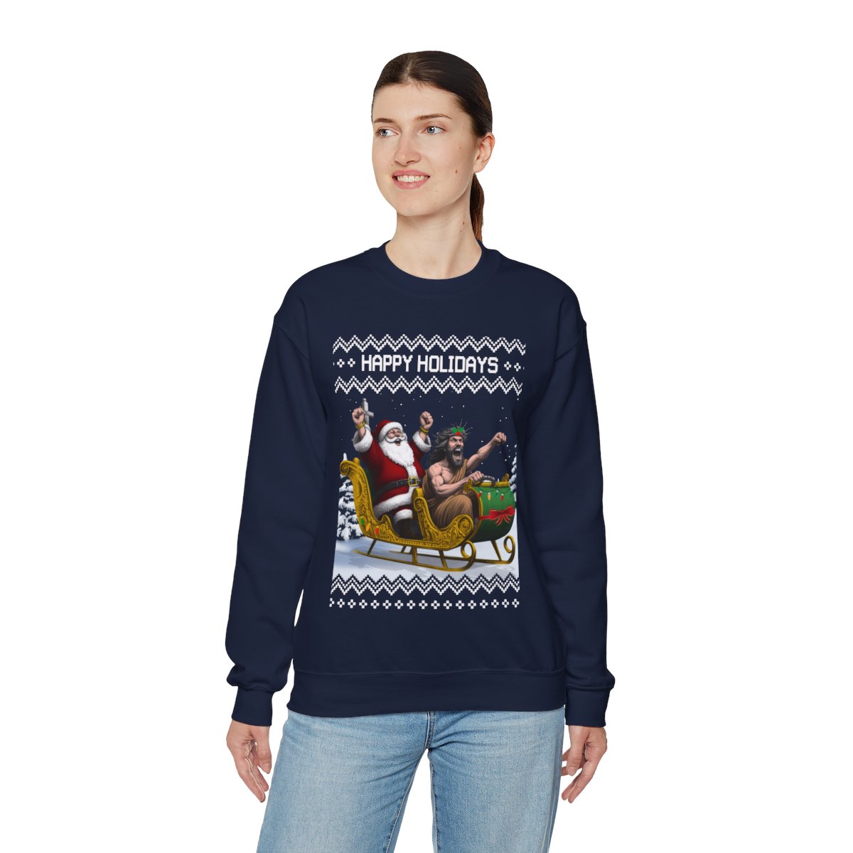 Put on Happy Holidays Santa Jesus Ugly Christmas Sweatshirt Womens to get in the spirit of the holidays
