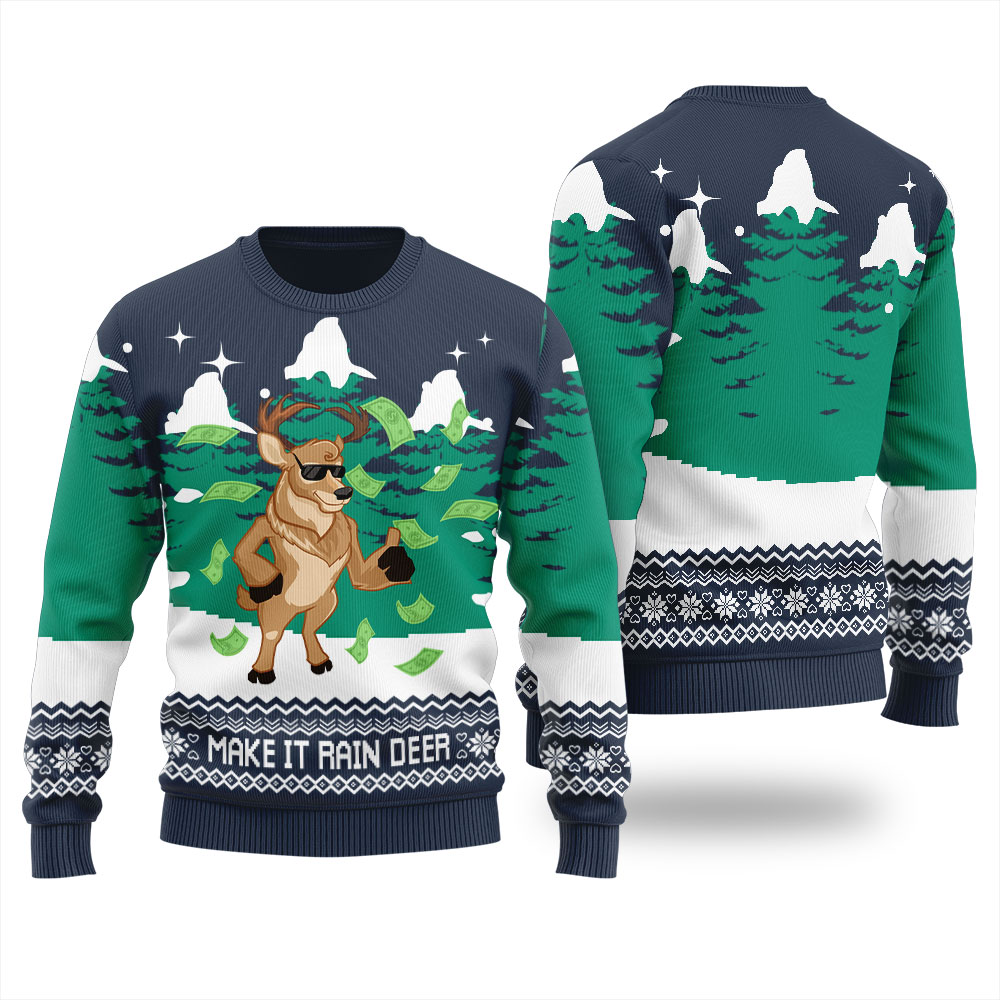 Make Your Holiday More Outstanding With Make It Rain Deer Ugly Christmas Sweater Navy!