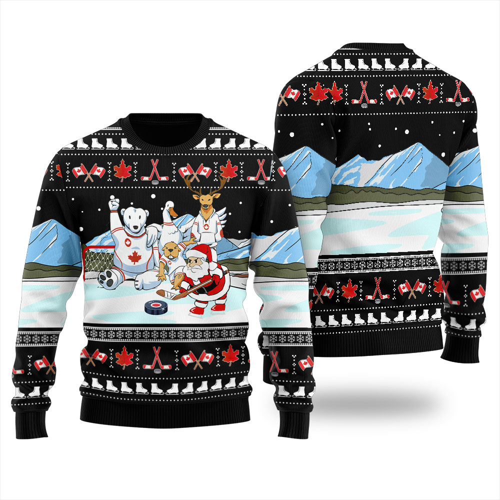 Santa Playing Hockey With Canada Animals Ugly Sweater Black