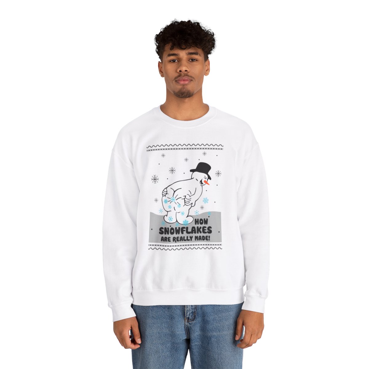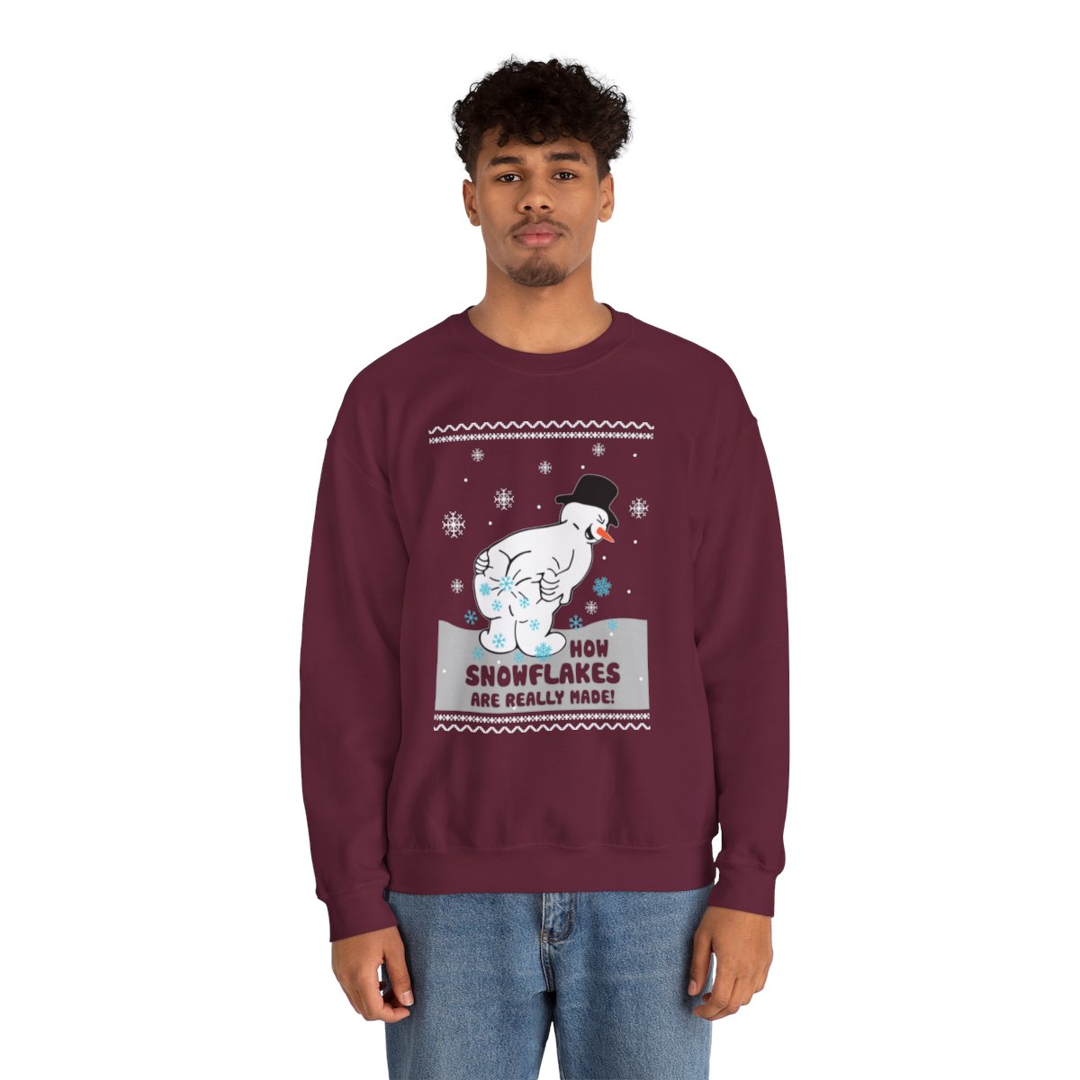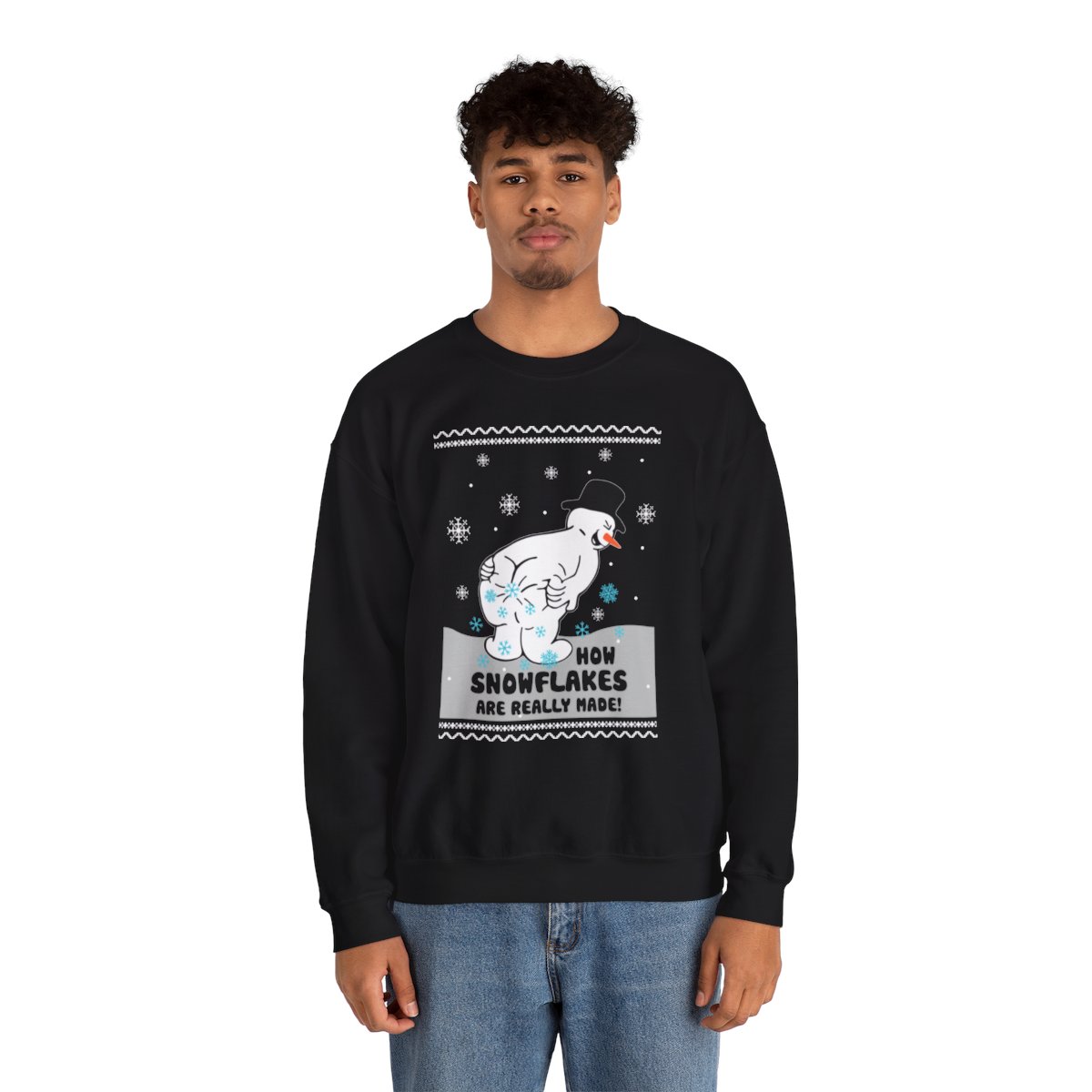Put on Snowman Making Snowflakes Ugly Xmas Sweatshirt to get in the spirit of the holidays