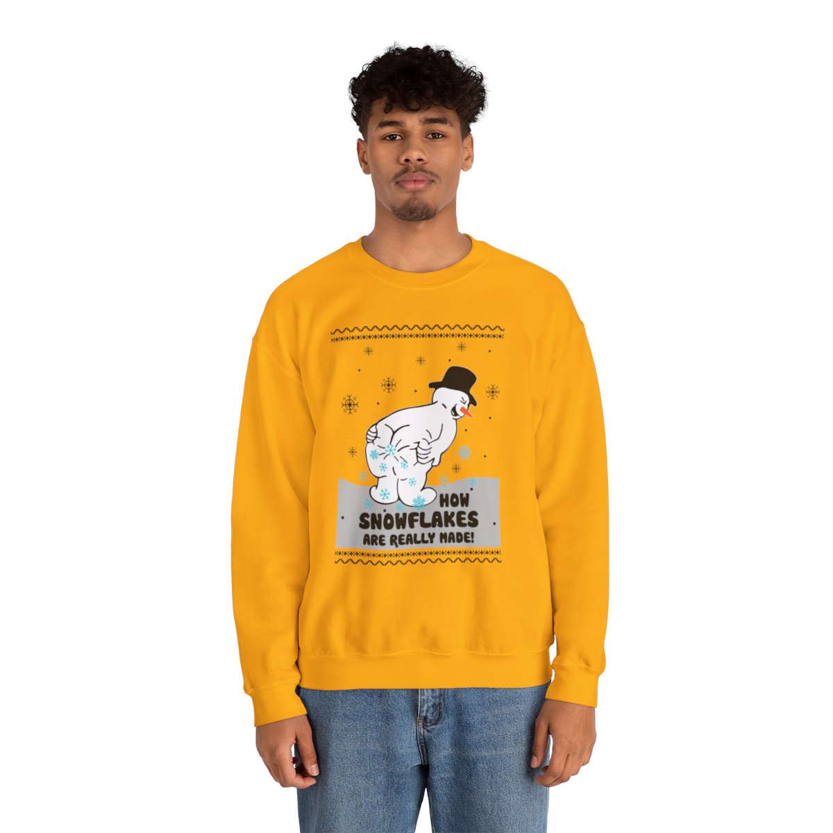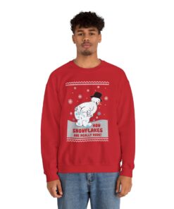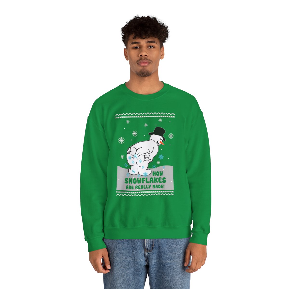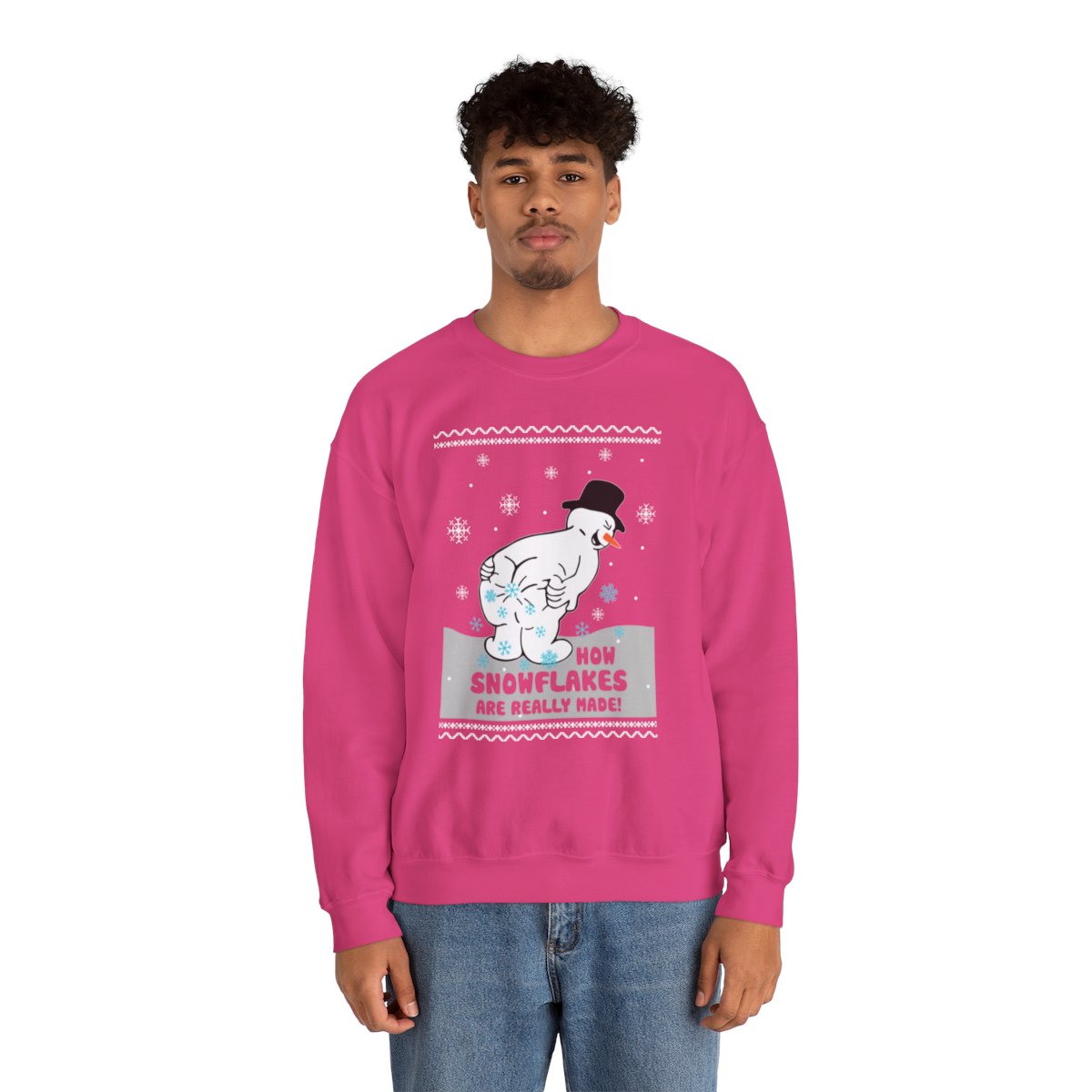 Put on Snowman Making Snowflakes Ugly Xmas Sweatshirt to get in the spirit of the holidays